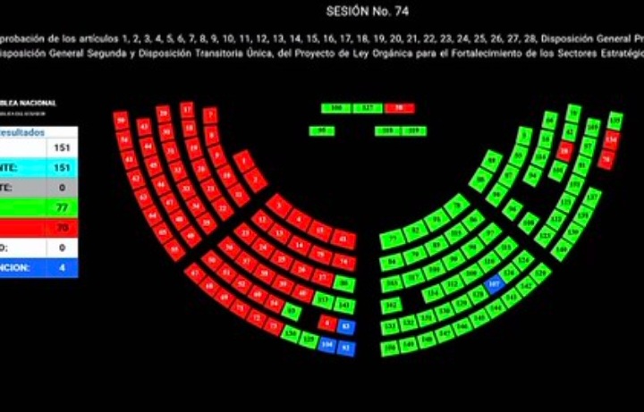 QUITO,ECUADOR.-El Pleno de la Asamblea Nacional aprobó con 77 votos afirmativos el proyecto de Ley Orgánica para el Fortalecimiento de los Sectores Estratégicos de Minería y Energía, calificado como urgente en materia económica, en la sesión 74. La iniciativa tiene como objetivo consolidar un marco legal que permita fortalecer dos áreas estratégicas para el desarrollo nacional, por su aporte a los ingresos del Estado, la generación de empleo y la provisión de servicios básicos como la electricidad.