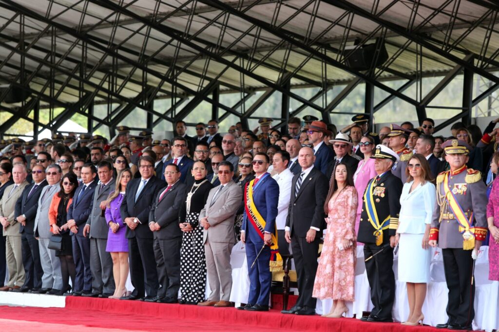 En su intervención, Adatty resaltó la valentía del presidente Noboa y efectuó la entrega del Bastón de Mando, por el liderazgo de autoridad, su ejemplo de servicio y por velar por el bienestar de la ciudadanía. Asimismo, tras las acciones emprendidas en el marco del conflicto armado, durante el evento se otorgó la Condecoración al Mérito Militar en el Grado de Gran Cruz al Estandarte de Grupo de Inteligencia Militar N84 Pichincha y al Grupo de Fuerzas Especiales N26 Cenepa, cuyas labores han sido fundamentales para precautelar la seguridad en el país.
