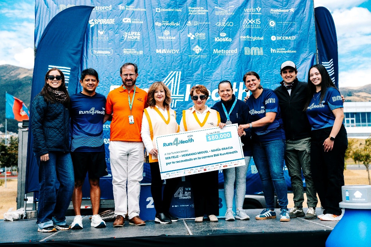 PIE DE FOTO.Entrega simbólica de la recaudación de la carrera BMI Run4Health 2025 a las tres fundaciones ecuatorianas: Fundación Ser Feliz, Fundación María Gracia y Fundación Hermano Miguel. El evento deportivo más solidario del país superó su meta y se proyecta a seguir creciendo en su próxima edición.