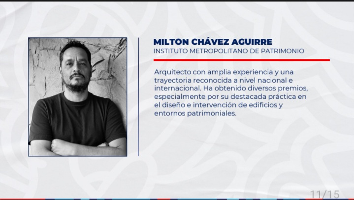 Milton Chávez.- Arquitecto con amplia experiencia y una trayectoria reconocida a nivel nacional e internacional. Ha obtenido diversos premios, especialmente por su destacada práctica en el diseño e intervención de edificios y entornos patrimoniales.