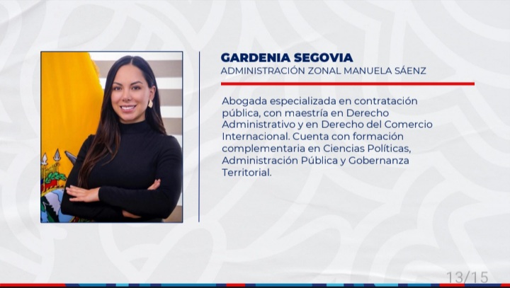 Gardenia Segovia.- Abogada especializada en contratación pública, con maestría en Derecho Administrativo y en Derecho del Comercio Internacional. Cuenta con formación complementaria en Ciencias Políticas, Administración Pública y Gobernanza Territorial.