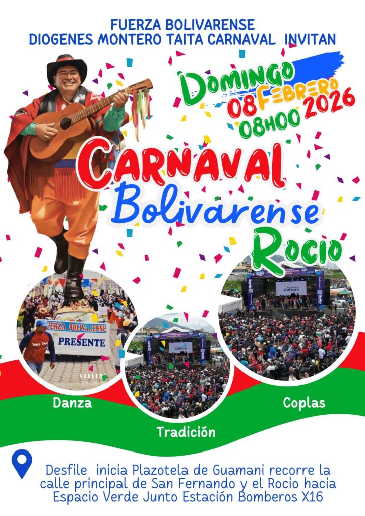 Este domingo 8 de febrero de 2026, a partir de las 8h00, se realizará la vigésima sexta edición del tradicional Carnaval Bolivarense del Rocío de Guamaní, la fiesta más alegre y colorida del sur de Quito!