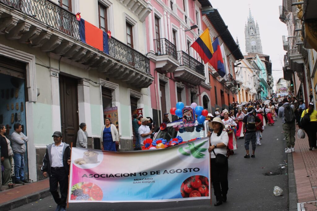 El tradicional Desfile de los Mercados inundó este miércoles de alegría las calles del Centro Histórico de Quito. Desde las 8h00, con mucho entusiasmo y alegría las ‘caceritas’ protagonizaron un desfile de comparsas y carros alegóricos, amenizados con la clásica música de bandas de pueblo, junto a un grupo de bastoneras y bandas de paz, para rendir homenaje a Quito.