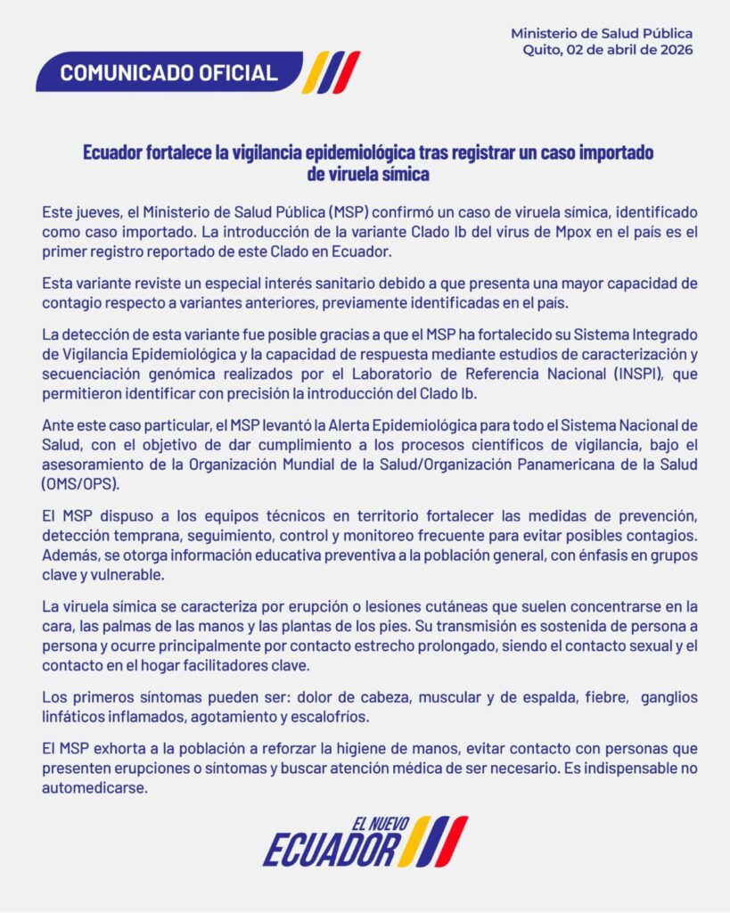 El Ministerio de Salud Pública confirmó anoche un caso de viruela símica, identificado como caso importado. La introducción de la variante Clado Ib del virus de Mpox en el país es el primer registro reportado de este Clado en Ecuador.