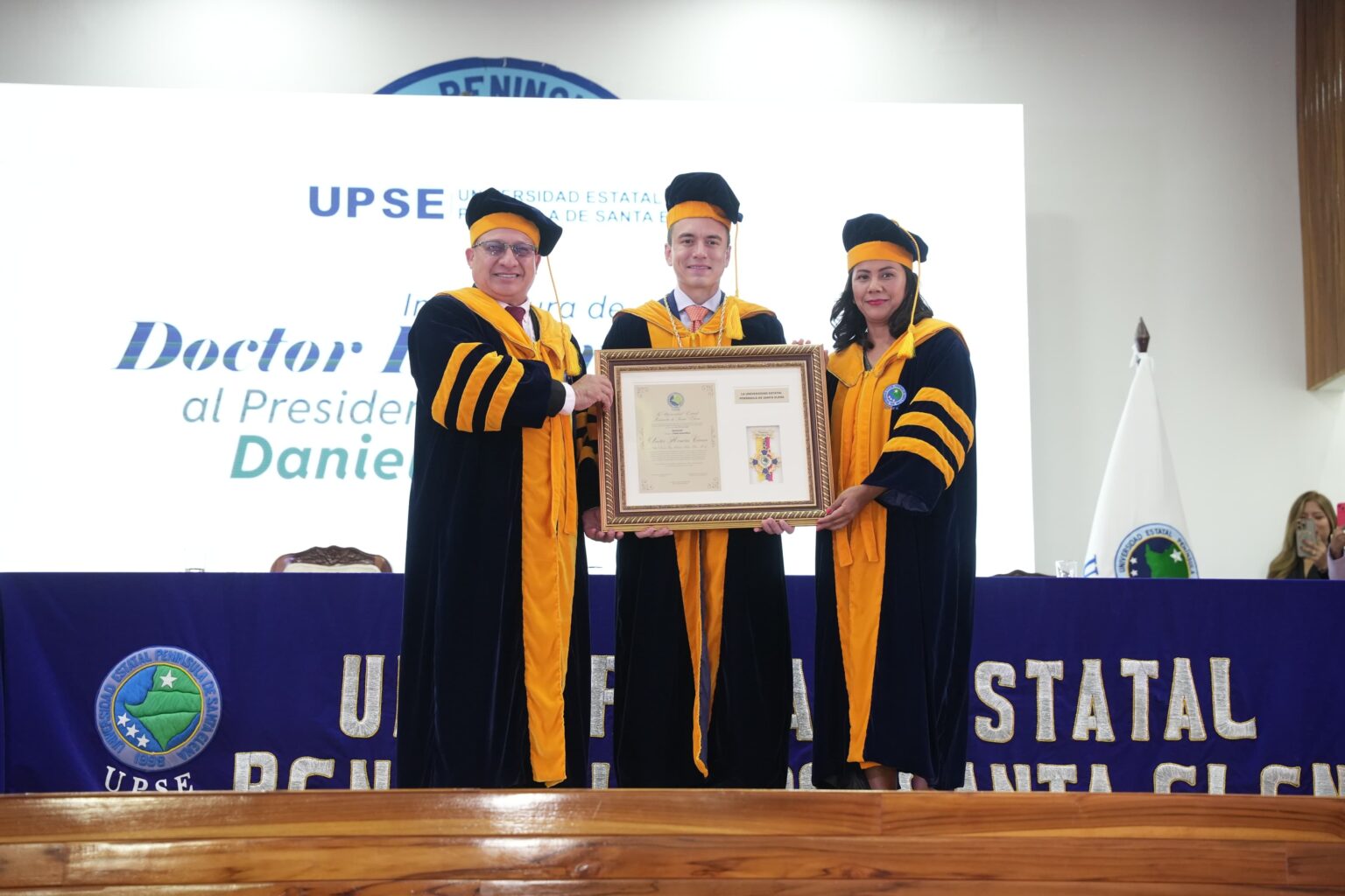 Por otro lado, el rector de la UPSE, Néstor Acosta, destacó la entrega del título honorífico Doctor Honoris Causa al presidente Daniel Noboa “por su trayectoria académica, social, cultural, política, por su aporte relevante a la educación y por su destacado desempeño profesional y de servicio público en altas funciones”. La investidura se llevó a cabo ante la comunidad académica, y autoridades locales y nacionales.