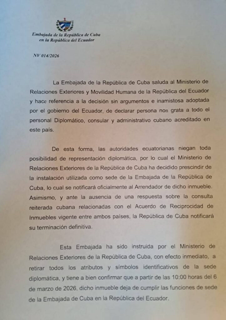 En consecuencia, a partir de las 10:00 a.m. (hora de Quito) de hoy 6 de marzo de 2026, el inmueble que hasta la fecha ha albergado la Embajada de Cuba en Ecuador cesa sus funciones como sede diplomática.
