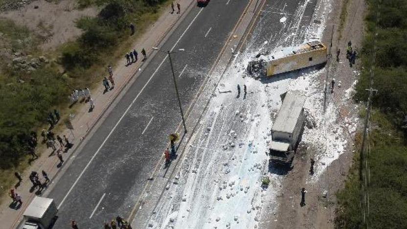 También se evidencia destrucción en la parte de adelante. A causa del siniestro, hay un aproximado de 180 metros de vía con pintura de agua derramada. Hasta el momento (12:00), la Panamericana Norte permaneció cerrada en ambos sentidos desde el desvío a Collas, hasta el redondel de Guayllabamba.