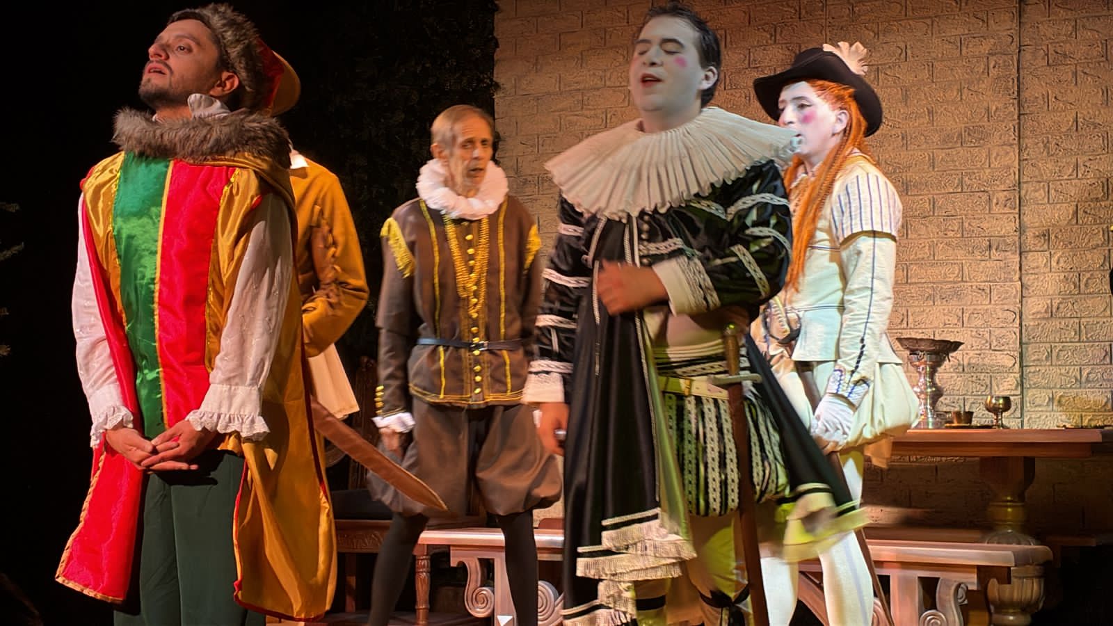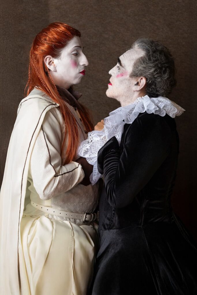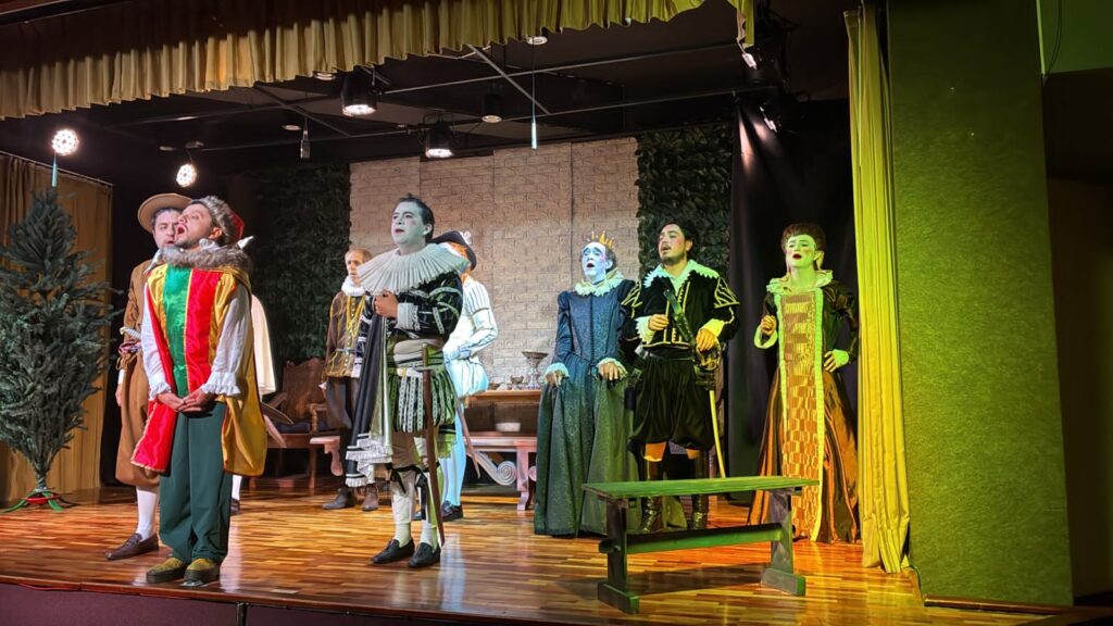 En esta nueva puesta en escena de Noche de Reyes, el director y actor César Salazar se toma muy en serio el concepto de “montaje histórico”. Tan en serio, que el público puede viajar a 1600 sin necesidad de una máquina del tiempo: maquillaje de la época, vestuario confeccionado como en los tiempos isabelinos y, por supuesto, actores hombres interpretando roles femeninos, como mandaba la tradición, incluyendo a dos gemelos reales para enriquecer la magia de esta obra.