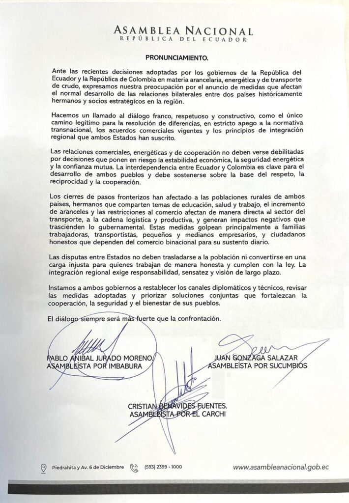 Ante las recientes decisiones adoptadas por los Gobiernos de Ecuador y Colombia en materia arancelaria, energética y de transporte de crudo, expresamos nuestra preocupación por el anuncio de medidas que afectan el normal desarrollo de las relaciones bilaterales entre dos países históricamente hermanos y socios estratégicos en la región, manifestaron los asambleístas: Pablo Jurado, Cristian Benavides y Juan Gonzaga.