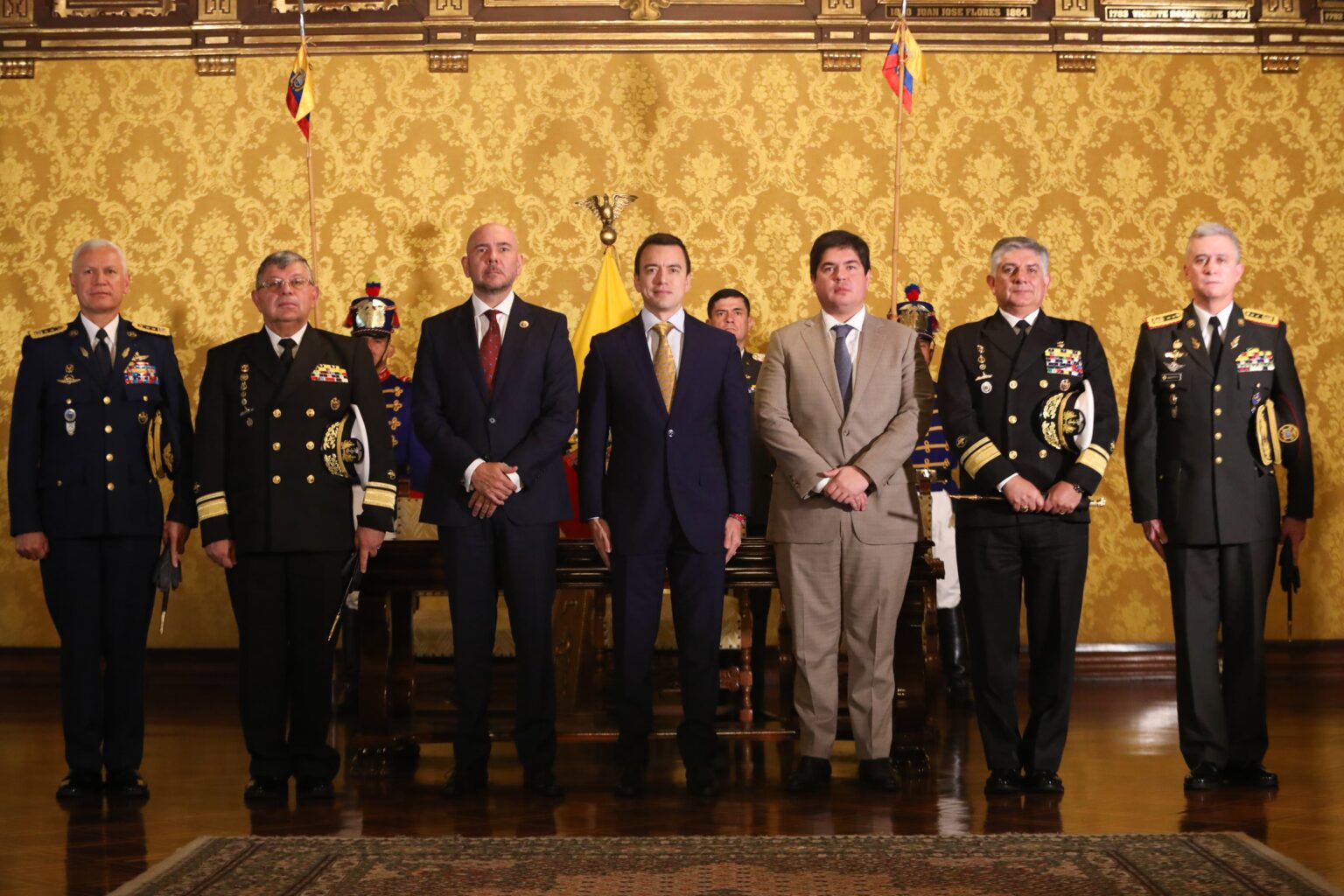 Junto a él estarán el General Edwin Addaty, comandante general de la Fuerza Terrestre; el contraalmirante Miguel Córdova, comandante general de la Fuerza Naval; y el brigadier general Celiano Cevallos, comandante general de la Fuerza Aérea. Las nuevas autoridades militares fueron oficializadas con el Decreto Ejecutivo N° 36.