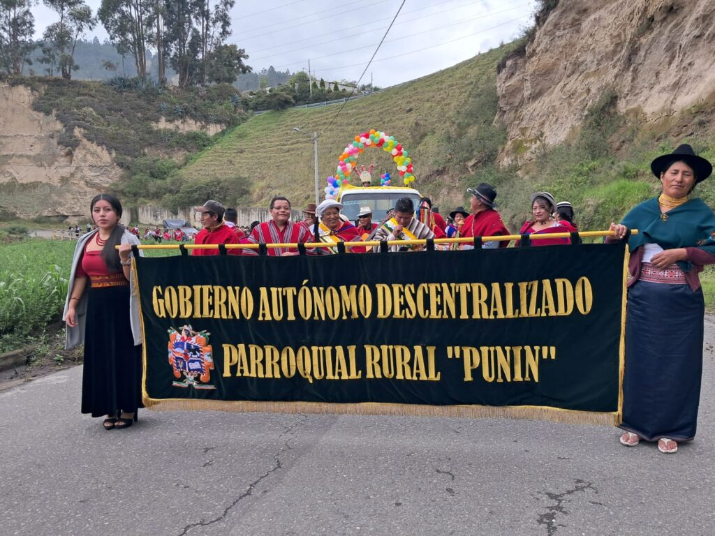 Al festejo se sumaron los miembros de la Asociación de Punenos Unidos Por el Cambio APUC con un carro alegórico que transportaba a la Reina de Punín, Karen Atapuña acompañada de un Soldado Guerrero Puruha.