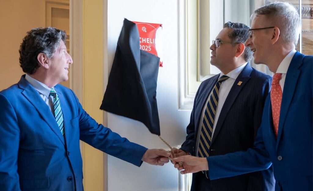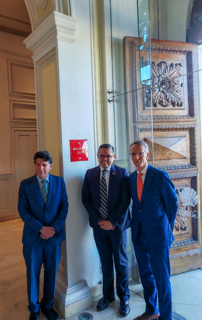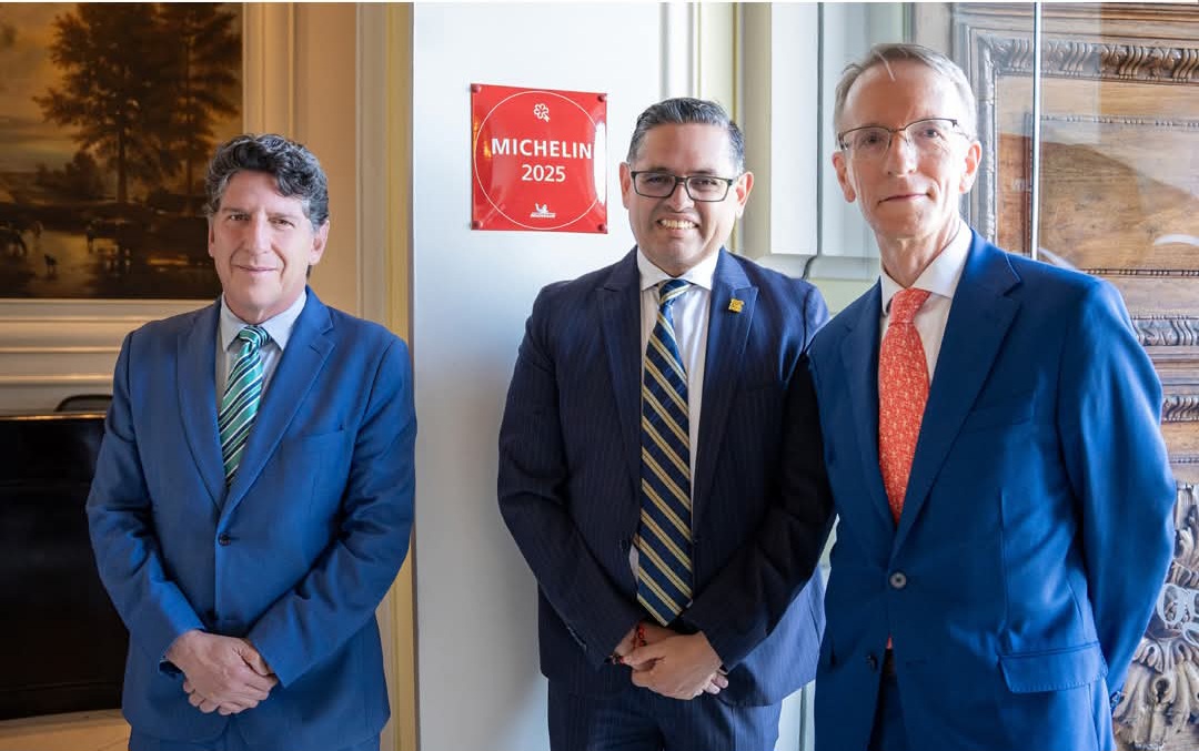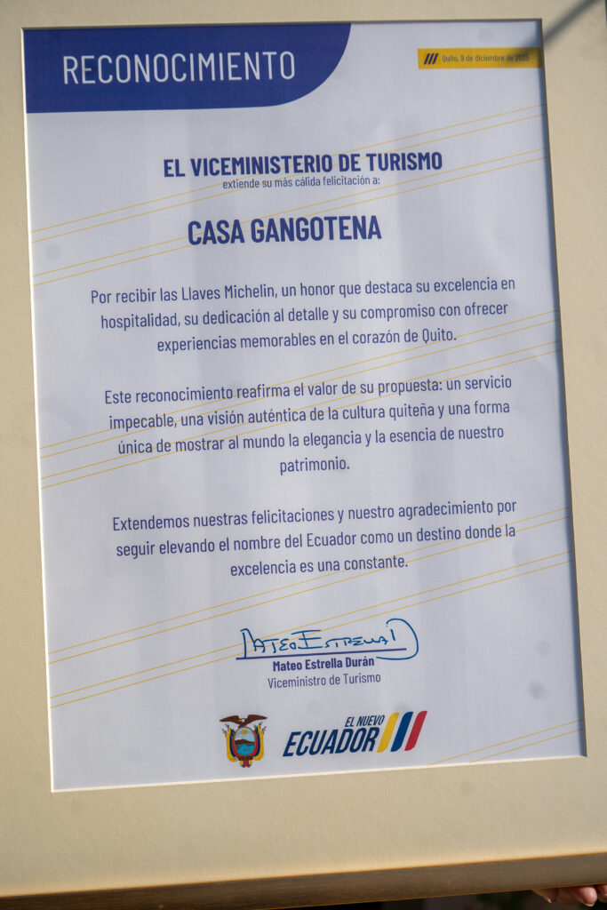 En una cálida y emotiva ceremonia este martes 9 de diciembre de 2025, el viceministro de Turismo, Mateo Estrella junto al embajador francés Philippe Létrilliart y el gerente de Casa Gangotena, Francisco Baca, develaron en una de las fachadas del complejo hotelero la placa oficial MICHELIN 2025.