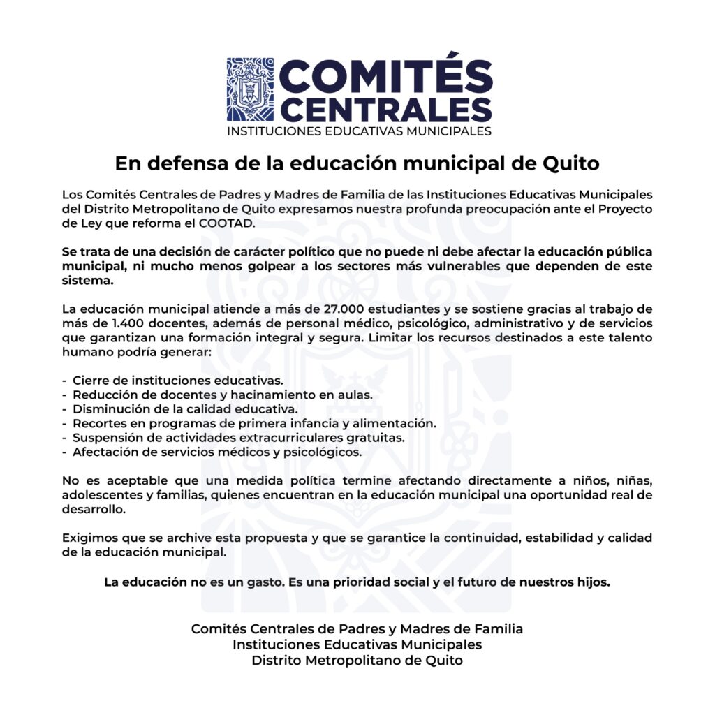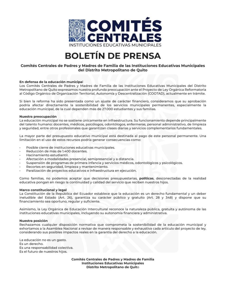 Los ‘Comités Centrales de Padres y Madres de Familia’ rechazan cualquier disposición normativa que comprometa la sostenibilidad de la educación municipal financiada por el Municipio de Quito desde hace varios años y exhortan a la Asamblea Nacional del Ecuador a revisar de manera responsable y exhaustiva cada artículo del proyecto de ley.