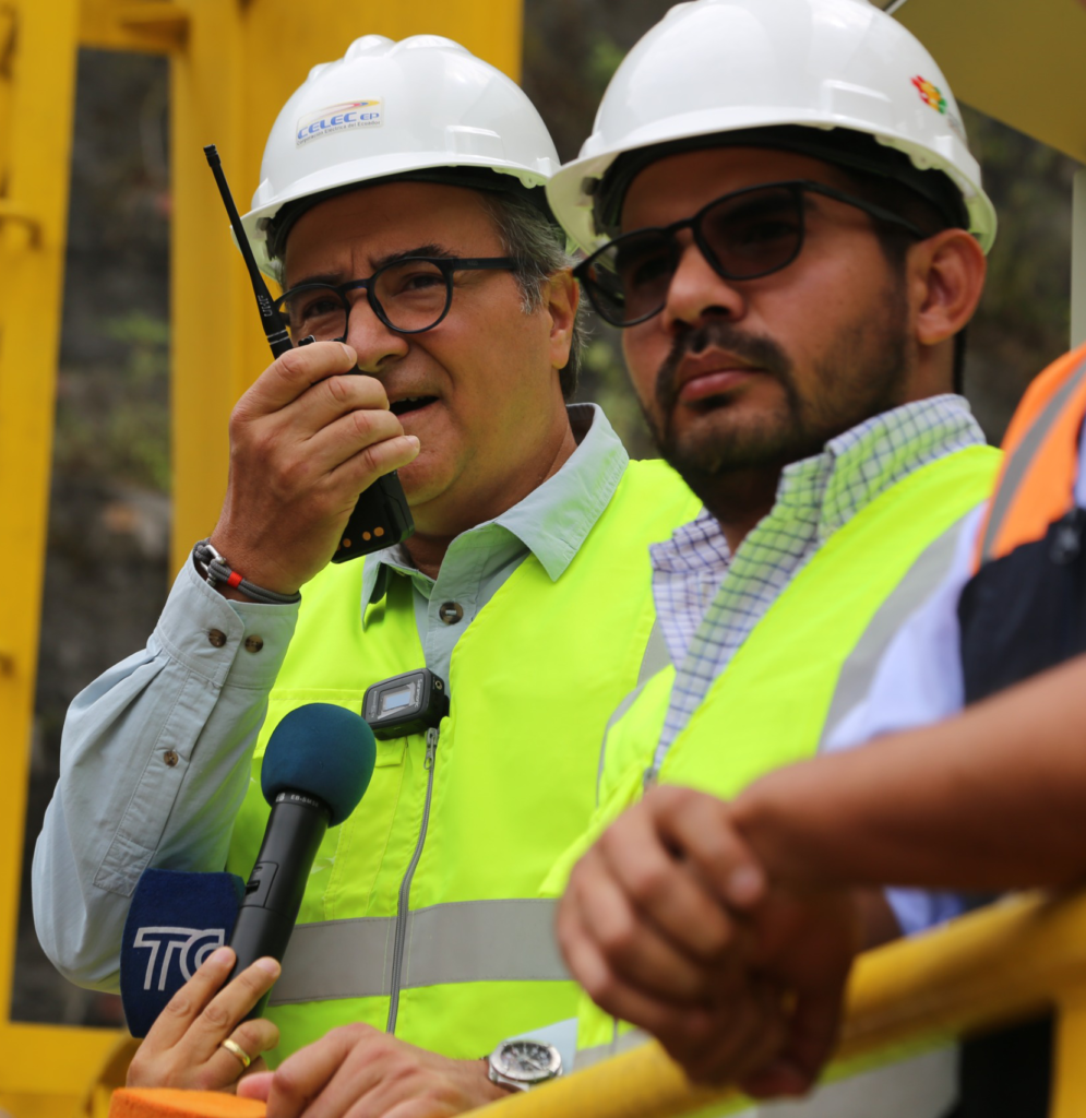 El ministro de Energía y Minas, Antonio Goncalves; junto al viceministro de Electricidad Energías Renovables, Rafael Quintero; y el gerente general de CELEC EP, Fabián Calero Freire, participaron en el retiro de la ataguía, realizada hace 12 años, con la finalidad de desviar el río Toachi y para construir la presa que alimentará a la central hidroeléctrica Alluriquín, que es parte del nuevo complejo hidroeléctrico Toachi Pilatón, de 254,4 MW.