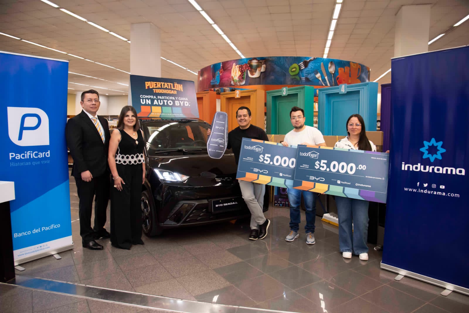 5 llaves, 5 puertas, 5 premios, cada vez que abras un puerta ganarás un premio espectacular y la última puerta te hará ganar un auto BYD, así se desarrolló la mecánica de la campaña Puertatlón de Todohogar que premia la fidelidad de sus clientes. Todohogar entregó los premios a los afortunados ganadores, en la foto empresarial de izquierda a derecha: